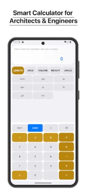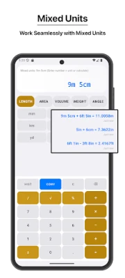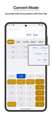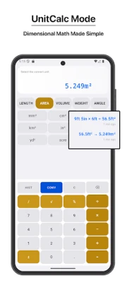 Είτε πρόκειται για λεπτομερείς μετατροπές μονάδων με την ειδική λειτουργία Conv, είτε για σύνθετους υπολογισμούς διαστάσεων, όπως μήκος, επιφάνεια και όγκος, μέσω της λειτουργίας UnitCalc, το Architect Calculator χειρίζεται τις προκλήσεις με απαράμιλλη ευκολία. Εισάγετε δεδομένα με φυσικό τρόπο, ακόμα και με μικτές μονάδες όπως "5m 30cm" ή "12ft 6in", και εκτελέστε υπολογισμούς κλασμάτων ή τετραγωνικών ριζών χωρίς κόπο. Κάθε ενέργεια γίνεται διαισθητικά, επιτρέποντάς σας να επικεντρωθείτε πλήρως στην ουσία του έργου σας.