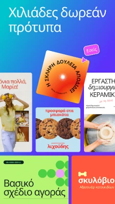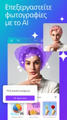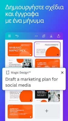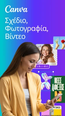 Από εντυπωσιακές αναρτήσεις για Instagram και Facebook μέχρι επαγγελματικές παρουσιάσεις και εταιρικές ταυτότητες, το **Canva** είναι ο απόλυτος σύντροφος για την οπτική σας επικοινωνία. Δημιουργήστε προσκλήσεις, φυλλάδια και επαγγελματικές κάρτες με ευκολία, ενώ το Κέντρο επωνυμίας σάς βοηθά να διαμορφώσετε το λογότυπο και την εικόνα της επιχείρησής σας με συνέπεια. Επιπλέον, μετατρέψτε απλές φωτογραφίες σε έργα τέχνης με ένα πλήθος εργαλείων επεξεργασίας εικόνας, χωρίς περιορισμούς ή υδατογραφήματα. Περιστρέψτε, περικόψτε, προσαρμόστε τη φωτεινότητα και εφαρμόστε φίλτρα με ακρίβεια, ή δώστε ζωή σε κινούμενα σχέδια και μεταβάσεις σε βίντεο, με ένα πανίσχυρο πρόγραμμα επεξεργασίας που συγχρονίζει τέλεια εικόνα και ήχο.