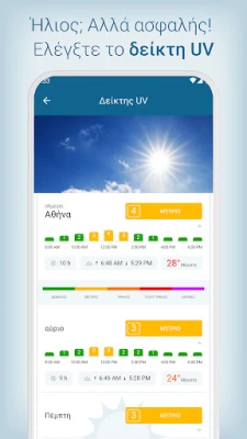 Σχεδιάστε αποτελεσματικά τις δραστηριότητές σας με την ολοκληρωμένη πρόγνωση για τις επόμενες 14 ημέρες. Αν η παραλία σας καλεί, δείτε την ιδανική στιγμή για βουτιές, με πληροφορίες για τη θερμοκρασία του νερού και του αέρα, την ισχύ των κυμάτων και την κατεύθυνση των ανέμων. Επιπλέον, ενημερωθείτε για την τρέχουσα υπεριώδη ακτινοβολία (UV), εξασφαλίζοντας την προστασία σας. Η εφαρμογή **Καιρός** παρέχει επίσης έγκαιρες προειδοποιήσεις για επικείμενες κακοκαιρίες, όπως καταιγίδες, απευθείας στη συσκευή σας, ώστε να λαμβάνετε άμεσα τα απαραίτητα μέτρα και να παραμένετε ασφαλείς.