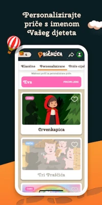 Θέλετε το παιδί σας να πρωταγωνιστεί σε μια δική του, μοναδική ιστορία; Αναζητάτε έναν εύκολο τρόπο να αποκοιμηθεί ή να διασκεδάσει σε κάθε περίσταση, από μακρινά ταξίδια έως αναμονές; Η Pričalica είναι η πρωτοποριακή εφαρμογή που μεταμορφώνει αυτές τις επιθυμίες σε πραγματικότητα. Αναπτυγμένη στην Κροατία, προσφέρει έναν μαγικό κόσμο αφήγησης, φέρνοντας τις ομορφότερες παιδικές ιστορίες από κάθε γωνιά της γης, προσαρμοσμένες στην καρδιά του μικρού σας ακροατή.