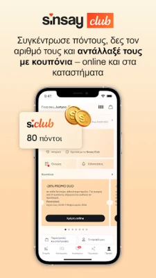 Η Sinsay επιβραβεύει την επιλογή σας καθημερινά, προσφέροντας ελκυστικές ευκαιρίες και ειδικές εκπτώσεις. Ελέγξτε συχνά για νέες προσφορές, συμμετέχετε σε προκλήσεις και επωφεληθείτε από μοναδικά προνόμια που κάνουν τις αγορές σας ακόμα πιο συμφέρουσες. Γίνετε μέλος του Sinsay Club και ξεκλειδώστε έναν κόσμο αποκλειστικών προνομίων, συγκεντρώνοντας πόντους με κάθε αγορά που μετατρέπονται σε κουπόνια αξίας έως και 15 EUR. Επιπλέον, η Sinsay έχει σχεδιαστεί για να απλοποιεί τη ζωή σας: παρακολουθήστε εύκολα τις παραγγελίες σας, προσθέστε αγαπημένα προϊόντα, πραγματοποιήστε επιστροφές χωρίς την ανάγκη απόδειξης και λάβετε ειδοποιήσεις για όλες τις νέες αφίξεις και προσφορές, όλα συγκεντρωμένα σε ένα περιβάλλον φιλικό προς τον χρήστη.
