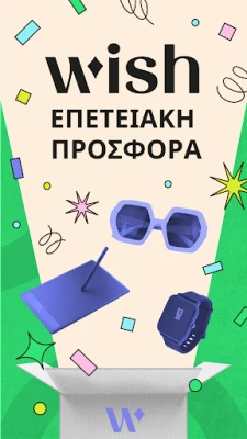 Γιορτάστε μαζί μας με τις Επετειακές προσφορές της Wish και επωφεληθείτε από ασυναγώνιστες εξοικονομήσεις! Ανακαλύψτε χιλιάδες προϊόντα με έκπτωση έως και 40%, και μην ξεχάσετε τον κωδικό WISHEVENT για επιπλέον 15%. Οι μοναδικές ευκαιρίες ολοκληρώνονται στις 7/7.
