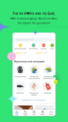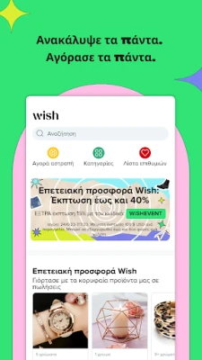 Η Wish κάνει την ανακάλυψη παιχνίδι! Βυθιστείτε στην έμπνευση μέσα από τα Wish Κλιπ, που ζωντανεύουν προϊόντα και ιδέες, ή περιηγηθείτε σε μια ατελείωτη ροή εξατομικευμένων προτάσεων, ειδικά σχεδιασμένων για τα δικά σας ενδιαφέροντα. Επιλέξτε με σιγουριά από τους αξιόπιστους Premier Εμπόρους και βρείτε αυθεντικά είδη από τις αγαπημένες σας επωνυμίες. Η εξοικονόμηση στην Wish είναι παντού: περιστρέψτε τον τροχό της Αγοράς-αστραπής για να ξεκλειδώσετε αποκλειστικές προσφορές περιορισμένου χρόνου, κερδίστε εκπτώσεις έως και 50% με τις καθημερινές σας επισκέψεις συγκεντρώνοντας σφραγίδες πιστότητας, και απολαύστε εποχιακές προσφορές και κωδικούς κουπονιών που κάνουν κάθε αγορά ακόμα πιο συμφέρουσα.